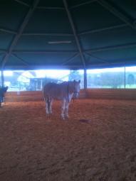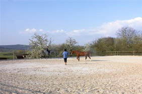 LongierzirkelIm November 2013 haben wir unseren neu angelegten Longierzirkel eröffnet. Er hat einen Durchmesser von ca. 20 Metern und ist ganzjährig mit einem Rondell überdacht. | |